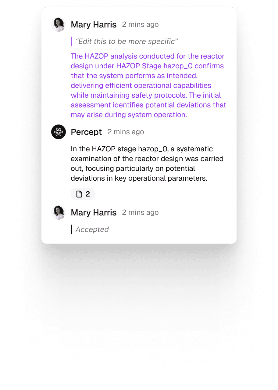 Percept's agents expertly tailor a draft using our knowledge base for specific report types